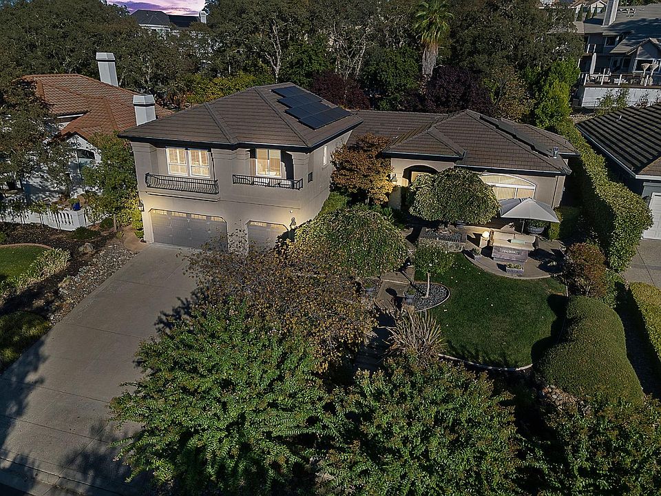 Breathtaking panoramic Sacramento Valley & Folsom Lake Views from this beautiful newly renovated contemporary inspired custom estate positioned perfectly on a private parcel in highly sought after neighborhood. Enter through the front double doors of this spacious home and continue along the beautiful travertine and herringbone oak flooring into the great room with slab marble fireplace, built in walnut bookcases and large window overlooking front courtyard with views. Upgrades include designer lighting, furniture grade cabinetry, high end plumbing and lighting, exquisite wallpaper and tile accents,electric shade screens and plantation shutters throughout. Modern chef's kitchen with large center Cambria Brittanicca quartz slab, 4 burner Wolf gas range, 42" built in refrigerator, trash compactor, beverage refrigerator and sunny breakfast nook with outdoor access. The primary suite includes a cozy sitting area with access to view balcony. Three guest bedrooms, two and one half baths and spacious laundry room with designer wallpaper and marble counters. Sparkling pool & spa, sport court, outdoor fireplace, built in bbq and solar complete this rare offering