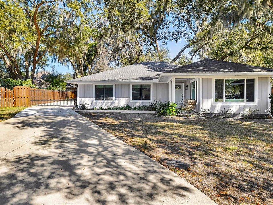 House has been totally renovated with additional property purchased in backyard and fenced. Backyard is gated with security code to open gate and on a cull de sac. New kitchen cabinets, flooring, counter tops, and appliances. Updated laundry room off the kitchen with side door to beautiful patio. Beautifully landscaped with sunroom overlooking backyard. Show beautifully. There is a 4th bedroom or currently being used for an office or den with built in bookcases.