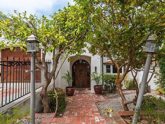 The ground floor offers flexible living with three more bedrooms, two baths, and a family room with kitchenetteideal for guest quarters or in-law living. French doors open to a tiled patio and a terraced backyard that's a true oasis: shaded by mature trees and enhanced with paver patios, a clover lawn, fire pit, and an impressive collection of fruit trees (avocado, lime, orange, loquat, guava, grapefruit, passion fruit, and lemon), plus a vibrant bougainvillea and bottlebrush tree. Best of all, a private gate leads directly to El Retiro Park, complete with tennis courts, basketball, playground, and library.