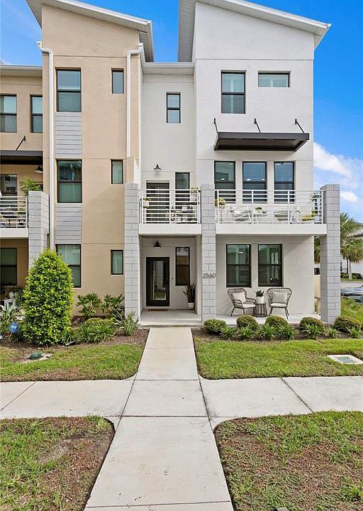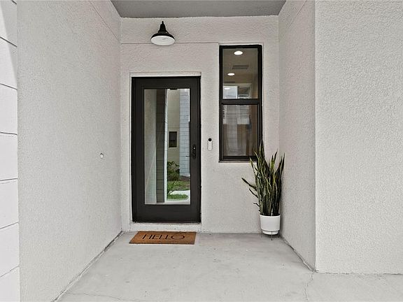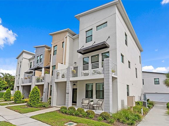 Experience modern living in this newer construction corner unit, featuring three bedrooms, 3.5 baths and an oversized two-car garage that is EV charger ready. The abundance of natural light from the extra windows fills the home, highlighting its open, contemporary design. The ground floor offers a private bedroom with en suite with direct access to the front patio and sidewalk, ideal for guests or multi-generational living. The main level features a spacious open-concept layout connecting the kitchen and family room. The kitchen showcases quartz countertops, an attractive backsplash, and a modern island with bar seating and subtle waterfall edge, making it stylish and functional. A custom electric fireplace with built-in storage and mantle creates a cozy focal point, and the large terrace balcony expands the entertaining space. A half bath and laundry room complete this floor. Upstairs, the primary suite boasts a large walk-in closet and a spa-inspired bath with oversized tiled shower, accompanied by another en-suite bedroom for added privacy. Built in the final phase that includes hurricane-rated windows, this home offers upgrades not found in earlier builds. The windows, plantation shutters and high-end finishes add security and elegance throughout. The gated community offers peace of mind and resort-style amenities, including a heated outdoor pool, outdoor grills and barbecue area, fire pit with lounge seating and a fenced dog area. Conveniently close to downtown and Central Avenue, you're just minutes from dining, shopping and entertainment. This attractive unit combines thoughtful design, convenient downtown access and first-class amenities—all wrapped up in a home that has it all. Don't miss your chance to live the lifestyle you've been dreaming of.