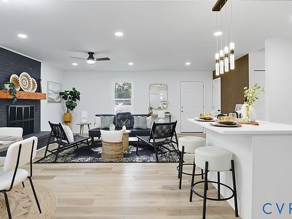 Welcome to this beautifully updated single-story home offering modern style and everyday comfort. The inviting front exterior and welcoming entry lead into a bright open-concept floor plan filled with natural light, wood-style flooring, and recessed lighting. The kitchen features white cabinetry, stainless steel appliances, pendant lighting, and an oversized breakfast bar that opens to the dining and living areas, making it perfect for both entertaining and daily living. Multiple living room spaces offer flexibility, accent walls, and wide windows with serene views. Spacious bedrooms include options with plush carpet, ceiling fans, and accent details. Bathrooms are tastefully updated with modern vanities, decorative tile, and a mix of shower/tub combinations and stand-alone showers. Enjoy outdoor living on the large deck overlooking a private backyard with plenty of space for play, gardening, or entertaining. Additional highlights include a laundry room with washer and dryer hookup, updated trim and baseboards, and move-in ready finishes throughout. Conveniently located near shopping, dining, and commuter routes, this home offers a blend of tranquility and accessibility.