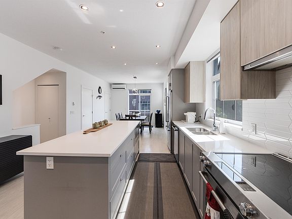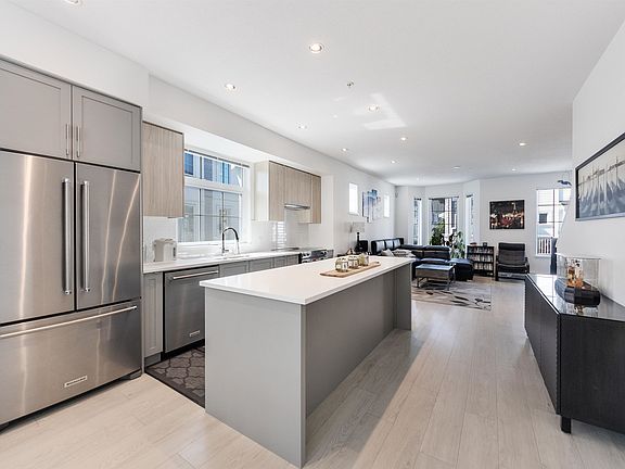 Quality built by Boffo Properties. Air conditioned. Quiet inside Corner Home. Open layout with centre kitchen island, separate living room and dining room space on main level. Upstairs with 3 bedrooms, 2 baths. The open concept 9 ft ceiling living level has ample kitchen storage and features Caesar-stone quartz countertops and stainless Kitchen-Aid appliances. Family sized dining and living with wide plank. Just like brand new home. 2 outdoor areas with fully fenced yard and deck. Move in conditions. Best choice for your family. Open House OCT 5 Sunday 2:00pm-4:00pm.