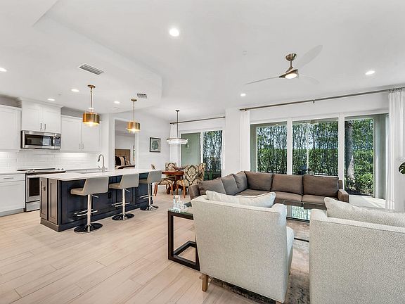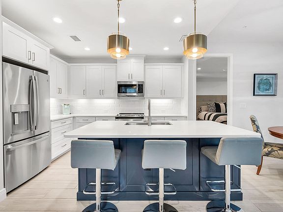 Are you seeking a move-in-ready residence that offers privacy, designer-curated interiors and effortless luxury? This fully furnished, first-floor Keswick end-unit carriage home, built in 2022, is the best-priced property in Seychelles and showcases refined living with lush private garden views and southeastern exposure. Thoughtfully decorated by a professional interior designer, the residence is filled with modern finishes and timeless style, offering two bedrooms, two baths and impact-rated windows and doors throughout. Inside, the open floor plan features tile flooring in the main living areas, recessed lighting and an airy, sophisticated ambiance. The kitchen is a showpiece with white shaker-style cabinetry, under cabinet lighting, quartz countertops, a tile backsplash and stainless steel appliances including a range, microwave and French-door refrigerator with ice maker. A large center island with a bar counter anchors the kitchen, seamlessly connecting to the adjacent dining area with chandelier and spacious living room, both of which offer access to the landscaped lanai—a private retreat ideal for quiet mornings or al fresco entertaining. The primary suite features a tray ceiling and a beautifully designed en-suite bath with a dual-sink vanity, a frameless glass walk-in shower tiled floor-to-ceiling, and an oversized walk-in closet with built-in shelving located within the bath for added convenience. The guest bedroom offers a large walk-in closet and is situated adjacent to a bathroom with a shower-tub combo, providing comfort and privacy for visitors. Residents of Seychelles enjoy access to resort-style amenities, including a tropical pool, spa, state-of-the-art fitness center and a 4,500-square-foot clubhouse. Ideally situated minutes from Naples' beaches, shopping and dining, this beautifully furnished home delivers comfort, sophistication and exceptional value in one of Southwest Florida's most desirable gated communities.
