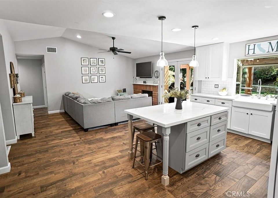 Completely remodeled, SINGLE STORY, modern ranch floorplan featuring that OPEN California great room design! Boasting 4BR + a LARGE BONUS ROOM (or optional 5th Br/office/gym/music rm/family rm etc) & is also located at the END of the CUL-DE-SAC and JUST STEPS from your front door are the pool, paseos and a grassy play area! With OWNED SOLAR just installed in 2022 to save on your electricity, this home has been completely remodeled throughout the entire house with major upgrades! This home also has a separate entrance into the bonus room making it a perfect 2nd master, Next Gen suite, rental or possible AIRBNB; so many options! Your STUNNING modern kitchen which opens to your family room boasts white Quartz countertops, the popular deep farmhouse sink with modern faucet and fixtures & an under sink reverse osmosis system. The coveted white custom cabinetry with soft drawer close and custom pull out shelving in the pantry will be sure to impress! The oversize island with designer hanging pendant lights, allows for extra seating when you entertain! The rich, wood-look tile floors are easy maintenance with a designer’s flair! Every modern and popular detail of this home has been added: with trending grey and light paint tones throughout the house, updated white moulding & finishes, modern knobs, fixtures, hinges & lights! All of the bathrooms have also been remodeled with upgraded flooring, designer fixtures, chic tiles, modern lighting, cabinets, showers and bathtubs! A beautiful barn door adorns your entry into your remodeled primary bathroom! Gorgeous French doors lead to the expansive backyard if the cul-de-sac and park aren't enough! PLUS, this home features: upgraded 4 ton central HVAC & ducting system, an updated tankless water heater, an upgraded 200 amp electrical panel, a WIFI enabled garage door opener with an upgraded garage door! This home is located in one of the most coveted neighborhoods behind Granary Square, which is just minutes to shopping, restaurants, the top schools, and freeway! With multiple pools and parks to walk to and with one of the LOWEST HOA’s in SCV & NO Melloroos, located AT THE END OF THE CULDESAC, you won’t find another home to compare it to! It’s been redone to highlight that California style open floorplan, and with it’s prime location, lot size, cosmetic upgrades, energy efficient upgrades, solar, all of the bedrooms AND IT’S A SINGLE STORY – this amazing property will go fast!