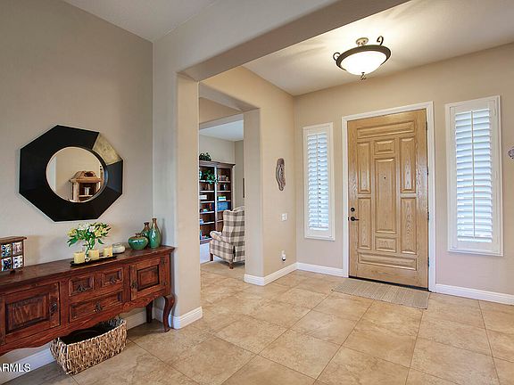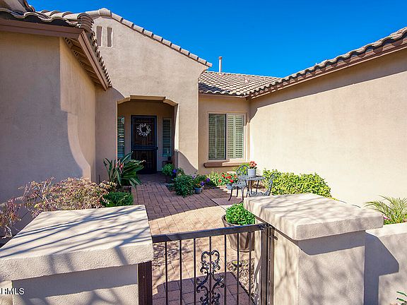 As you arrive, you're greeted by an inviting desert-landscaped front yard and a private courtyard—a perfect spot for morning coffee or an evening glass of wine. Step inside, where pride of ownership is evident in the elegant finishes and custom details throughout. The gourmet kitchen is a chef's dream, and the home is complemented by custom interior shutters throughout, a built-in office desk and bookcase in the 3rd bedroom, as well as in-ceiling speakers in the great room—ideal for entertaining or unwinding. The 3-car garage is a standout, featuring epoxy flooring and custom cabinetry for optimal storage and organization.