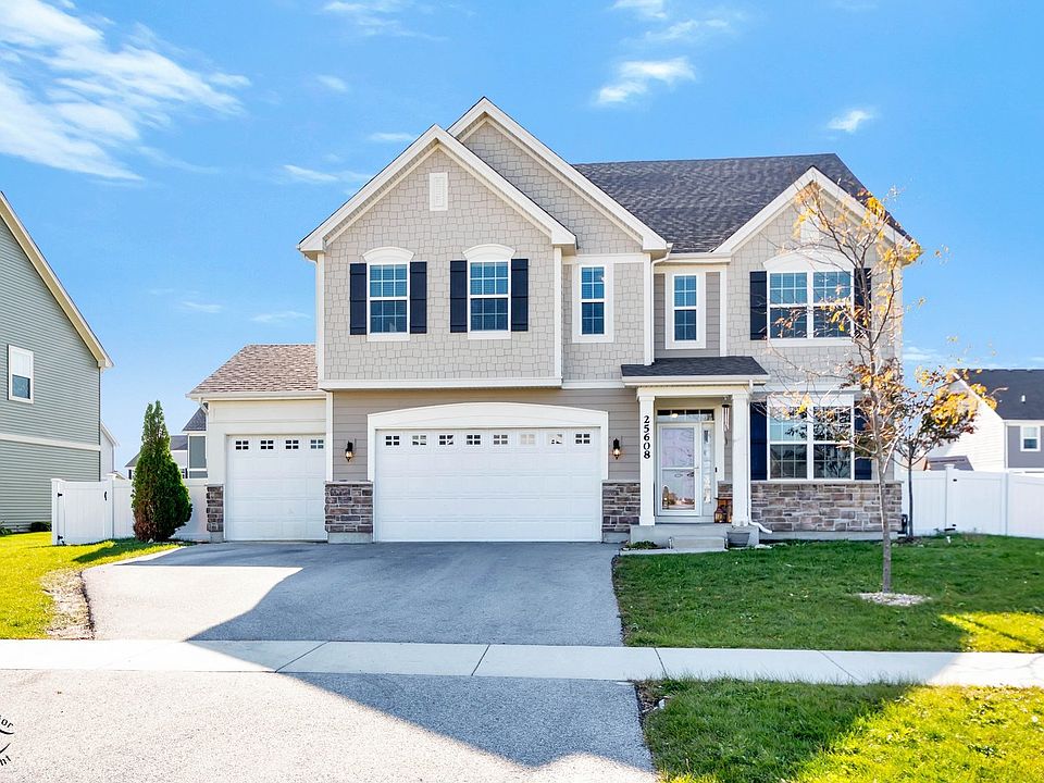 Welcome home to this elegant home that will make you feel at home the moment you step foot in the door. Home has just been freshly painted throughout! Brand new trendy farmhouse light fixtures! Perfectly laid out 3100+ square ft home features 4 large bedrooms, 2.5 baths, 3-CAR GARAGE, dining room, flex room/ living room, mudroom, loft, and basement. Enhanced kitchen includes upgraded designer cabinets, pendant + recessed can lighting, large walk-in pantry, stainless steel appliances; expansive island overlooking spacious breakfast and family room areas. Double sliding glass door with tons of natural sunlight walk out into your own large fenced in backyard! Yard is completely fenced with a 6 foot white vinyl privacy fence. Nice play set for the kids. Luxury master bath with dual bowl vanity, ceramic tile, and exquisite glass-door shower! Extra windows in stairwell and master bath, volume ceilings on the main level, oak rails, ceiling fans throughout most of the home, dual bowl vanity in both full baths. Loft upstairs makes a perfect play room or movie room. Upstairs laundry room! Magnificent stone and architectural shingles beautify the exterior. Great location, award winning schools and close to all the shopping/restaurants Plainfield has to offer!