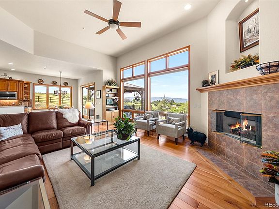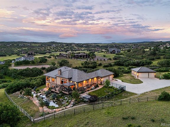 Welcome to this stunning retreat nestled on 5.4 private acres in the prestigious equestrian friendly Keene Ranch community. Set back 600 feet from the road, this custom home offers breathtaking panoramic views of the Front Range and twinkling stars at night. Designed for both luxury living and rural tranquility, the property is equine-friendly, allowing up to four horses, with direct access to a network of dedicated community riding trails. The residence features two heated 3-car garages—one attached, one detached—perfect for car enthusiasts or additional storage. Enjoy extensive professional landscaping, a large pond with cascading waterfalls, stamped concrete walkways, and low-voltage underwater lighting that create a magical outdoor ambiance. A fully fenced perimeter with solar-controlled gated entry, matching stone mailbox pillars, and a concrete driveway enhance the property’s privacy and curb appeal. Inside, you’ll find over 5,100 square feet of elegant living space with an open floor plan, vaulted ceilings, and sophisticated finishes throughout. The home boasts two expansive primary suites, each with ensuite baths, along with two additional bedrooms, a second family room, and two dedicated offices. The walkout basement is bright and spacious, and the home is handicap accessible with no-stair garage entry and wide doorways. Additional features include a whole-house Generac generator, Bullfrog in-ground spa, water treatment system with reverse osmosis at the kitchen sink, central vacuum, Hunter Douglas window coverings (6 with power operation), three EV charging stations, radon mitigation system, Boral Concrete Tile Hail and Fire Resistant Roof and more. Included in the sale are a Kabota enclosed cab tractor with snowblower (Model 2650) and a 2018 Kabota zero-turn riding mower (Model Z421KW-54). Keene Ranch offers approx. 247 homes on acreage, friendly neighbors, and an abundance of wildlife, and more. Minutes from Dawson Butte Open Space.