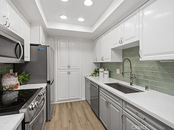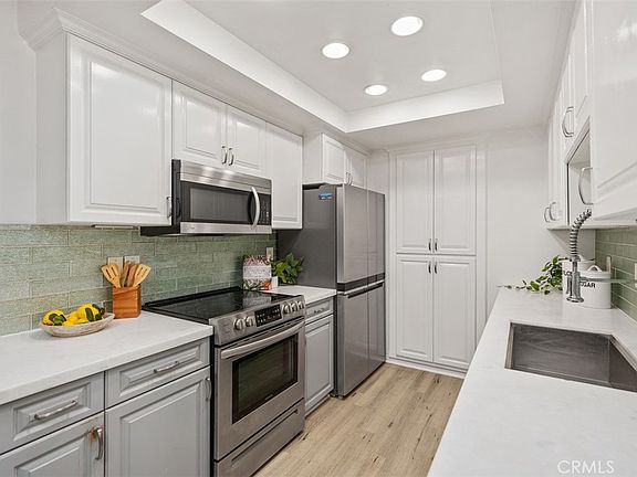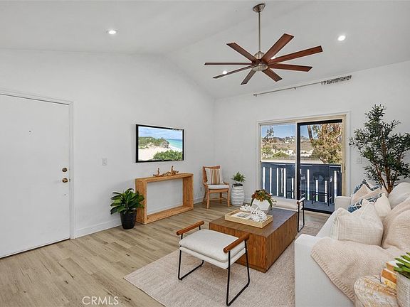Just minutes from the sand and surf of iconic Doheny Beach, this upper-level corner home in Dana Point blends coastal charm with modern updates and an unbeatable location. Featuring 2 bedrooms and 2 full bathrooms across 870 square feet, this light-filled retreat boasts a spacious, open layout with vaulted ceilings and an airy ambiance. The living room opens to a private balcony, perfect for enjoying serene views and ocean breezes, while the updated kitchen features stainless steel appliances, crisp white and grey cabinetry, and a cozy built-in dining nook. Both bedrooms are comfortably sized, and the primary suite includes abundant built-in storage and a remodeled en-suite bath. Luxury vinyl flooring flows throughout, creating a cohesive and inviting atmosphere. A rare find in such a prime location, this home also includes in-unit laundry and a tranquil community setting surrounded by mature trees and manicured greenbelts. Whether you're looking for a full-time coastal residence or the perfect weekend getaway, this turnkey property offers the best of Dana Point living, all an incredibly short distance to the beach, shopping, dining, and the vibrant harbor.