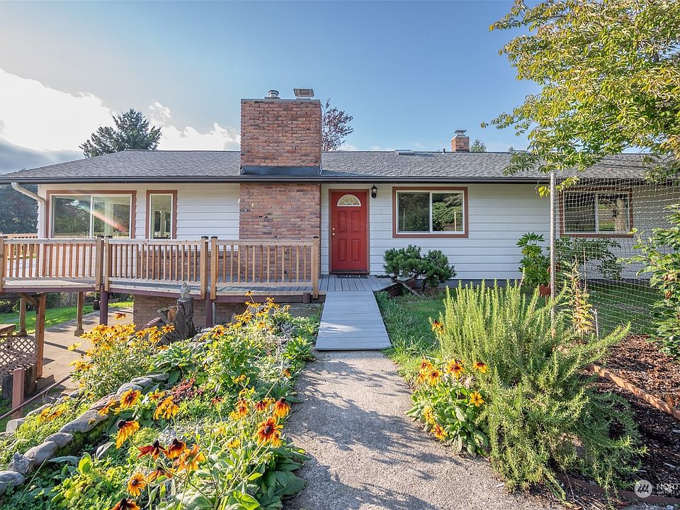 Light-filled contemporary home w/open floor plan, 4 bedrooms, 2.5 baths, office, and spacious lower level perfect for family room. Sun-drenched setting w/.64 acres, fenced gardens, lush garden beds, special plantings, & mature landscaping. The spacious living room is filled with light & captures views of the deck and backyard. It features vaulted ceilings, wood fireplace w/insert, walls of windows, tile/oak floors, and slider doors that open to brand new view deck. The kitchen is the perfect gathering place in the home & is open to living area. Unfinished lower level has a wood fireplace, half bath & extra room. New 4 bed PD septic (9/2023) & new roof in 2022. Community pool, club/beach. Close to county marine park with trails. Perfection!