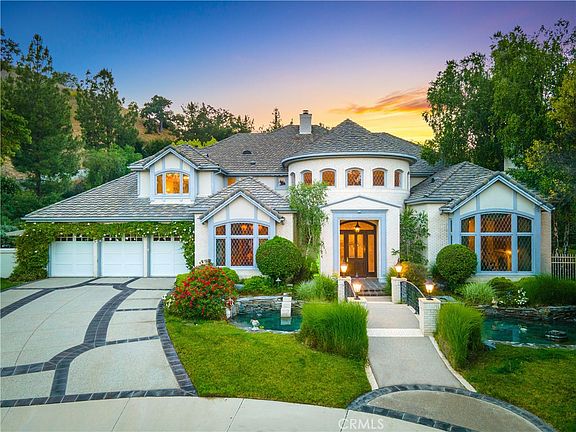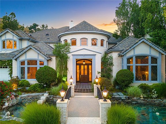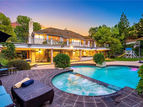 Discover the epitome of luxury living in the coveted Mountain View Estates of Calabasas with this sought-after Plan 10 home. As you step through the grand foyer, you'll be greeted by an impressive formal living room featuring coffered ceilings and a grand fireplace. The adjacent library offers a serene place to get work done or read a great novel. The family room is an entertainer's dream, showcasing spacious areas to rest and unwind with a movie, fireplace, and a stylish bar. The expansive open kitchen is a chef's delight, boasting a walk-in pantry, quartzite countertops, custom lacquered cabinetry, a breakfast bar, a large dining area, a desk, and an extensive butler's pantry for all your large gatherings opening up to the formal dining room enhancing the home’s entertaining spaces. On the first floor, you'll find two bedrooms, each with en-suite baths. Upstairs, the primary suite offers a luxurious retreat with double doors, a fireplace, a spacious area ideal for a gym or office, two separate walk-in closets, and a bar with a refrigerator. The primary bath is a sanctuary with a large sunken tub, two vanities, and oversized shower. Additionally, three spacious bedrooms with en-suite baths complete the upper level. The spectacular yard features an oversized covered patio perfect for lounging, dining, and watching TV, along with a full outdoor kitchen and outdoor heaters for year-round comfort. Enjoy the pool with its beautiful waterfall features, separate spa, surrounded by large open spaces for play, outfitted with natural grass. This truly luxurious offering in guard-gated Calabasas comes with Blue Ribbon schools, upscale entertainment, and fabulous amenities. With beautiful expansive waterfalls in the back cascading into the pool and a stunning water feature entrance, curb appeal, a back balcony, and a private stair entrance, this home is an extraordinary find and the epitome of outdoor entertaining.