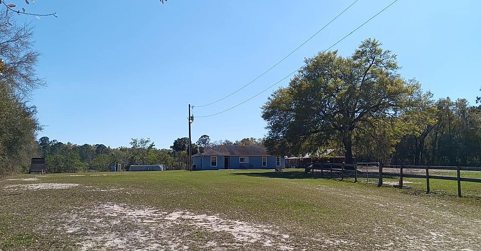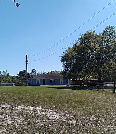 This block built 3/2 home with hurricane windows on 10 peaceful acres is a safe and secure place to bring your horses and to allow your dogs to run! The property is completely fenced, with 3 grass pastures, the barn has a new metal roof, 4 outdoor gaited feed pens with easy access to running water, a new grain, hay and tack shed. There is new outdoor lighting that allows you to see your horses at night. The property is high and dry. This property is within 1 hour of Orlando and the attractions. The beaches are 40 miles East and The Orlando International and Sandford airports, are an hour or less away. Ocala, The horse capital of the world, is just 50 miles North. The property is located on the edge of the Ocala forest for hiking, biking and riding trails, as well as many springs to enjoy year round. Popular Equine facilities include Rocking Horse, Black Horse, Silver Sands Bridle Club are easy access within 30-60 minutes, and the World Equestrian Center, Florida Horse Park and HITS are just a short trip away. There are excellent Farriers, Equine Vets and a multitude of trainers in the area. The 3 bedroom home has newer floors, freshly painted interior, new refrigerator, comes with washer and dryer, and the AC and well have been well maintained, the pressure tank is new. The drain field has been replace in September, 2024. There is a sitting patio on both the front and the back of the house, and a breezy covered area to relax and entertain under the barn, that includes the most beautiful view to the back of the property. There is an above ground pool with a newer pump.