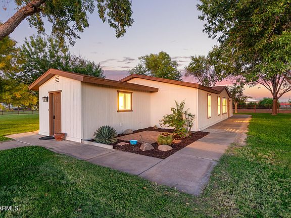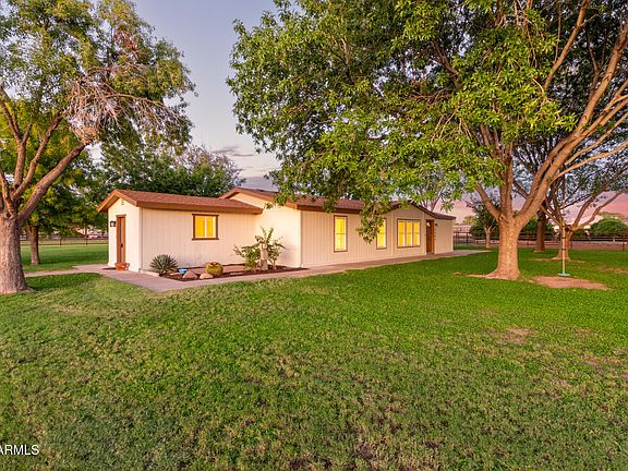Welcome to this beautiful 3.6-acre horse property featuring a 3-bedroom, 2-bath main home and an 850 sq. ft. guest home. The 1,344 sq. ft. main home offers a bright and airy Arizona room with windows all around, showcasing views of the lush green yard and mature trees. Inside, you'll find wood flooring, white cabinets, and a kitchen with stainless steel appliances and an inviting eat-in area. The large laundry room includes plenty of storage and a utility sink for added convenience. Equestrian lovers will appreciate the property's barn, horse stalls, corrals, tack room, and riding arena — everything needed for a complete setup. With no HOA, you'll enjoy the freedom to live, ride, and relax your way.