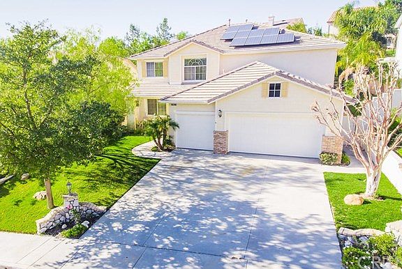 Lives like a single story! Popular master downstairs home with pool in Stevenson Ranch! Seller tastefully expanded this property to add a huge family room that really opens up the downstairs living space. Wood floors, crown molding, brand new carpet, new tile in baths, shutters & neutral blinds throughout, built-ins, sharp neutral paint inside and exterior was painted last year. Move-in condition! 2 newer A/C units and 3 car garage. Great yard with pool/spa, patio cover and nice flagstone hardscape. Open floor plan with master down, 4 beds up + huge loft with built-ins, plus second family room! Wow!