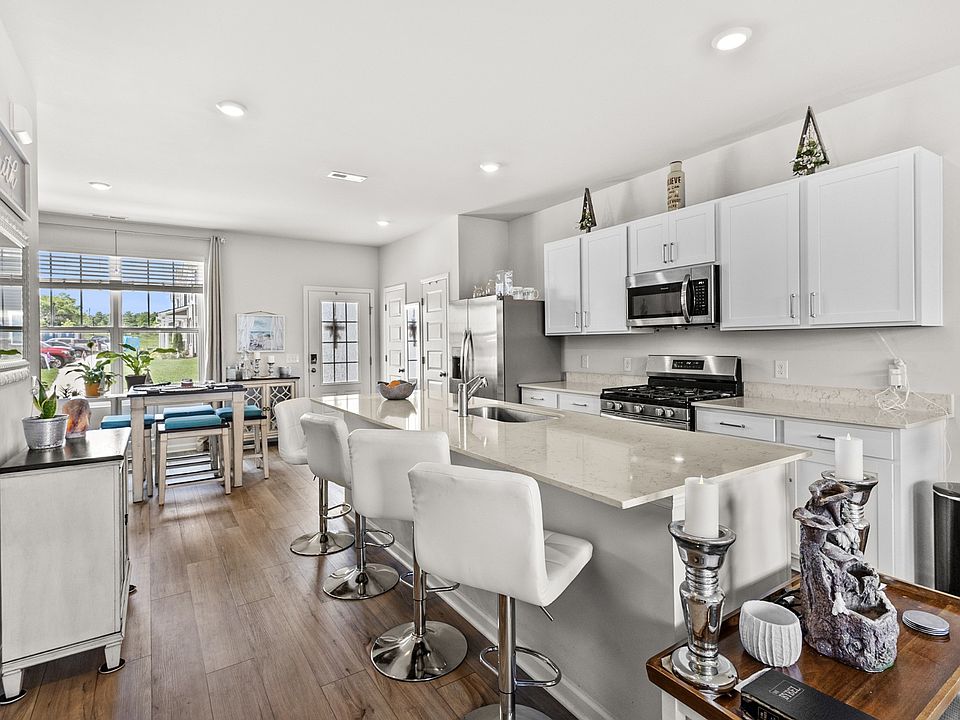 Step inside to an open-concept layout ideal for entertaining or everyday life, with chef inspired quartz countertops, oversized island seating for 4, stainless steel kitchen appliances with a gas stove and refrigerator included, luxury vinyl plank flooring throughout, 2-inch blinds, a Ring doorbell, and smart thermostats—all included