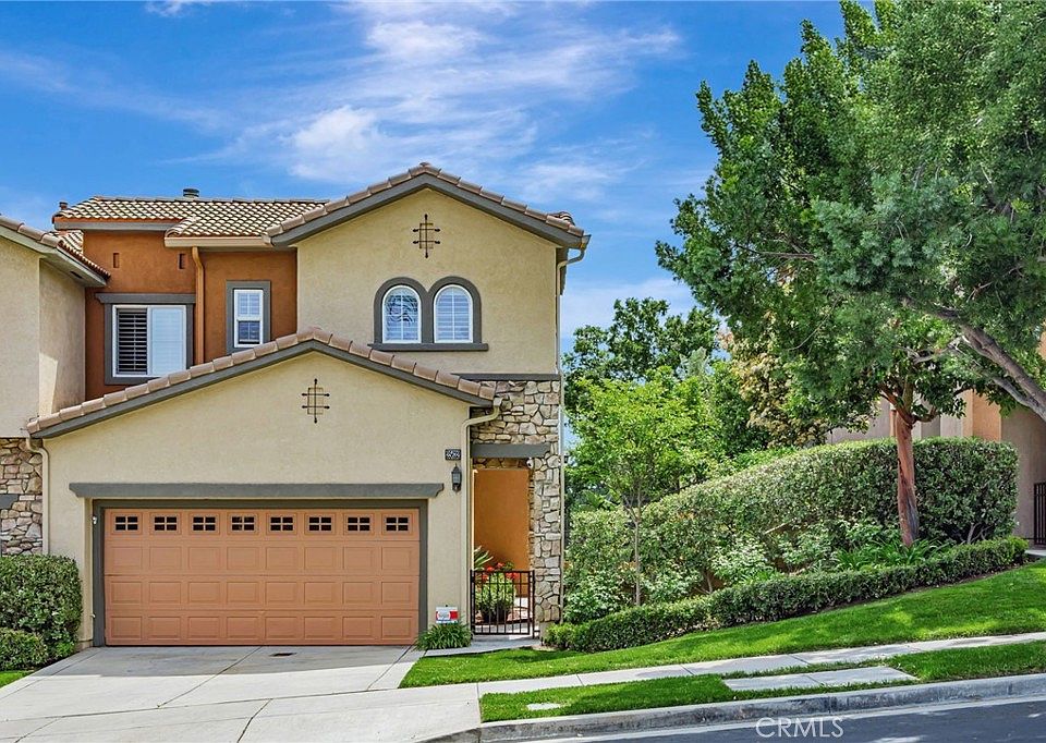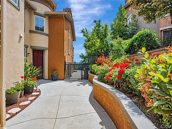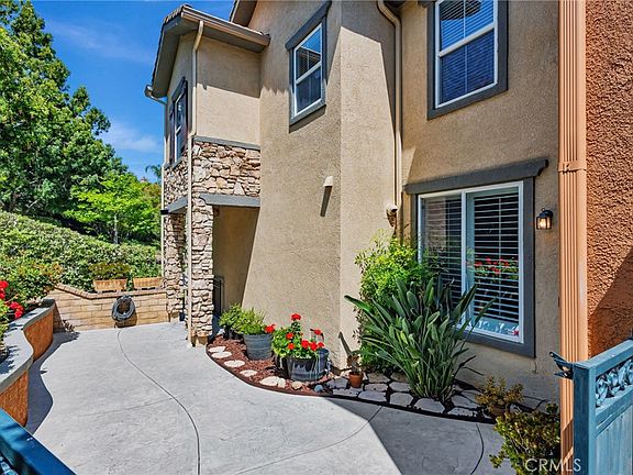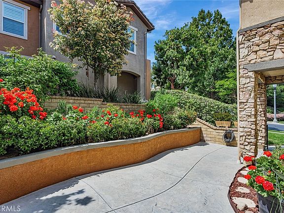 NO MELLO ROOS! GOLF COURSE VIEW! PAID OFF SOLAR! This beautiful move-in-ready 3-bedroom, 2.5 bathroom, 2,010 sq ft home is in the sought-after Gated Bella Ventana paired homes in the Valencia-Westridge community. An open floor plan with plentiful natural light, a built-in entertainment center, two fireplaces, a built-in office, plantation shutters and blinds. Newly installed LVP flooring on the first floor and a freshly paint interior. The kitchen is an entertainer’s dream with superfluous cabinet space, an updated stainless steel 5-burner stove, a granite kitchen island with a circular sit-up leading to the dining room, and access to the back patio. The family room features a fireplace and lots of natural light with views of the incredible backyard. Upstairs, you will find a spacious hallway leading to the expansive primary suite with a retreat area. The primary suite features his-and-her walk-in closets, a fireplace, and a sliding glass door leading to a balcony with breathtaking views. The primary bathroom has a spa bathtub, a separate shower, and double sinks. There are also two additional bedrooms and a guest bathroom with dual sinks with a tub and shower. Other features include a Tesla Powerwall 2 backup battery system, a Lennox 4-ton two-zone HVAC system, an outdoor built-in propane BBQ grill, engineered hardwood floors upstairs, a tankless hot water heater, crown molding in the primary bedroom, a built-in desk and shelves in the downstairs office, a built-in TV cabinet, laundry unit hookups and recessed lighting throughout the entire house. A direct-access two-car garage has built-in shelves, a workbench, an epoxy floor, a Rayne whole-house water filtration system, and an electrical car charger unit. Westridge is a wonderful community with amenities galore, including two pools and spas, two tennis courts, soon-to-be pickleball courts, and a basketball court. The community also has a park with barbeques, a picnic area, and a playground. There’s a clubhouse to rent for parties or business meetings. Westridge is walkable to all three highly rated schools and has easy access to the 5 freeway.