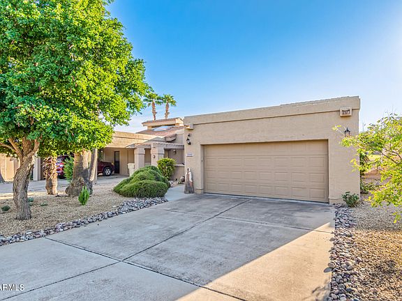 Welcome to this lovely 2-bed, 2-bath townhome, convenently located within walking distance to all Rio Verde amenities. It backs to the White Wing golf course, offering great views of two golf holes. 2-car garage with storage room & a charming front porch! The family/dining room captivates with its high vaulted ceilings, radiant natural light, elegant tile flooring, & a cozy fireplace that promises warmth on chilly evenings. The eat-in kitchen boasts sleek granite counters, newer cabinets, recessed lighting, SS appliances, plantation shutters, & serving window. The main bedroom is a serene sanctuary with plush carpeting, two closets, backyard access, & remodeled tile shower stilestone counter. Guest bedroom, with tub/shower, updated white vanity, custome mirror, & skylight. HURRY! Some furniture might be available on a separate bill of sale.