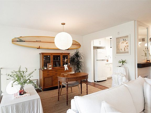 Step inside to an expansive open-concept living space, where new windows and an oversized slider flood the area with natural light, enhancing the exquisite wood floors that extend throughout. The kitchen is a masterpiece of design, featuring a quartz island and countertops, a stylish farm basin sink, charming vintage look refrigerator, Bosch dishwasher, electric range, sliding barn doors to pantry closet and curated lighting that highlights every detail. Large living area is currently configured with dining area in front of the kitchen island, living area with 75” included TV and convenient office space with striking sphere chandelier.