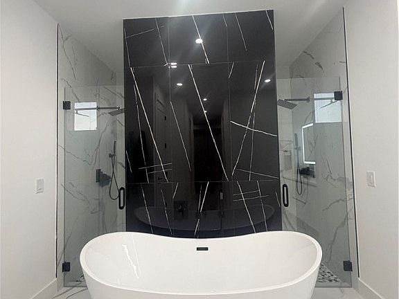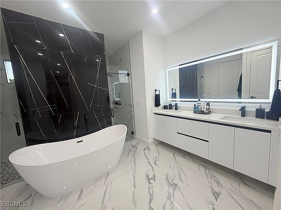 The primary suite offers two spacious walk-in closets, a large vanity, and a relaxing bathtub for ultimate comfort.