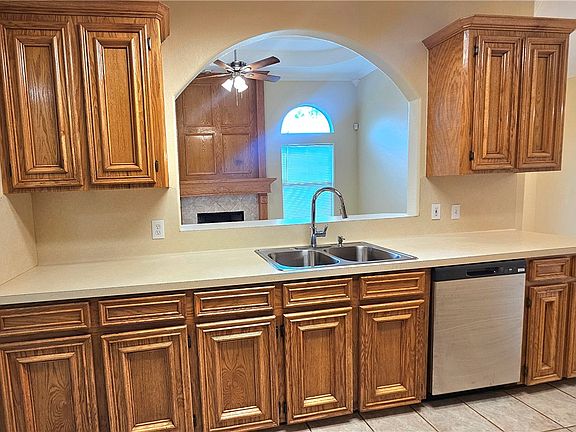 Custom oak cabinets throughout and lots of counter space are a major bonus in this 3/2/2! Double tray ceilings, crown molding and recessed lighting! Arched entries and arched windows! Built-in shelves compliment the beautifully accented fireplace! Stainless-steel with black stove dishwasher and overhead vent! An oversized laundry room located just off the garage can double as a mud room with the ample counters and cabinets. Tiled throughout! Open patio!