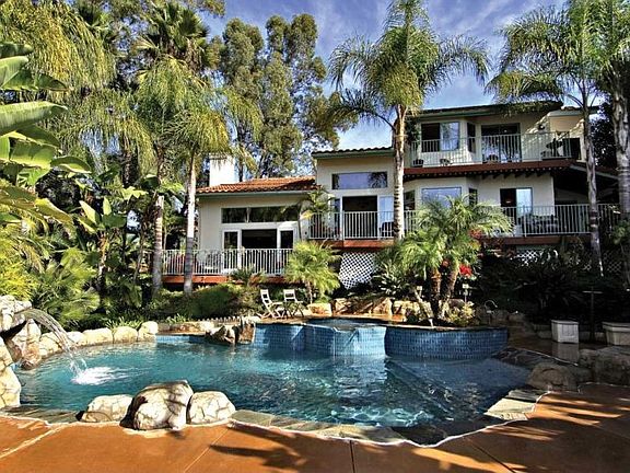 Come discover your own 3-bed, 2.5-bath resort-style custom home on over an acre of land & breathtaking views. Incredible lush landscaping, koi pond w/ waterfall & elaborate driveway welcome you to this sprawling home. Inside the home you will notice high end finishes such as travertine flooring, recessed/designer lighting, and beamed ceilings. The kitchen features a peninsula island with bar seating accented by granite counters & plenty of cabinet/food prep space and flows seamlessly to a generously sized breakfast nook. The dining room is perfect for family gatherings and has itâs own balcony. The family room has a private balcony, vaulted ceilings with beams, & a cozy fireplace accented w/ stone. The master features a private ensuite with dual sink vanity, a walk-in shower & soaking tub. Enjoy sunsets & views of the mountains from your own private deck. The secondary bedrooms are spacious & have access to a full bathroom. Youâll also appreciate a private theater room where you can lounge in style. Out back enjoy an entertainerâs dream yard that features a relaxing pool/spa complete with a grotto w/ waterfall & a walk in entrance while taking in the amazing views. Enjoy a full basketball court & batting cage area for the ultimate sports fan! There are endless possibilities to use the current unused space at the back of the property as well! Conveniently located close to schools, San Diego Zoo, parks, shopping, and freeway access. **Paid Solar** Welcome Home!