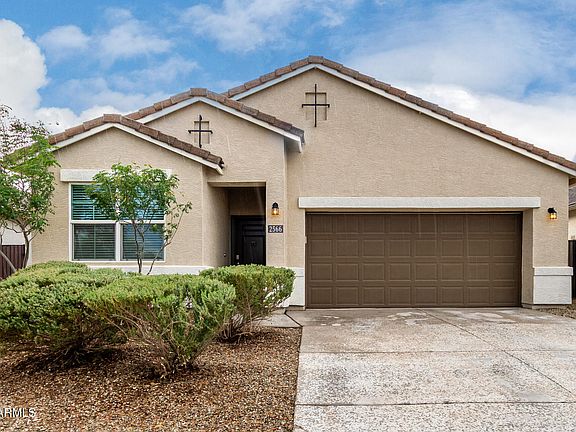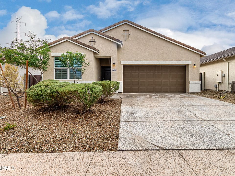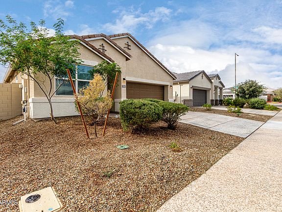 Welcome to Desert Moon Estates, where this beautiful home awaits you! Sits on a cul-de-sac, it offers 3 beds, 2 baths, 3-car tandem garage, & a manicured landscape. The interior exudes refined style with tons of natural light, neutral palette, wood-look tile flooring in common areas, and Berber carpet in bedrooms. Designed for everyday living & entertaining, the seamlessly flowing open layout is sure to impress! The impeccable kitchen boasts SS appliances, quartz counters, a subway tile backsplash, gray shaker cabinetry, recessed lighting, a walk-in pantry, and an island w/breakfast bar. Enter the primary bedroom to find an ensuite with dual sinks & a walk-in closet. Large laundry room with shelving. Check out the private backyard with a covered patio to relax or enjoy BBQ! Make it yours!