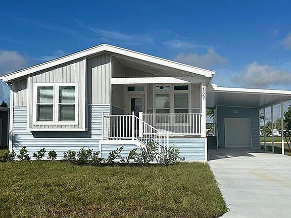 This beautiful Palm Harbor ""Summer Breeze"" has 2 bedrooms, 2 bathrooms and a den! The living room/dining room area is huge with a beautiful open kitchen and free standing counter. The main bedroom has a private deck overlooking the lake and the en suite bathroom is exquisite in its finish. The second bedroom is quite sizable as is the den. The long driveway (with covered carport) leads to a good size shed with steps leading to a utility room entrance. This home is a must-see! Leased land. Furniture package shown in home is available for purchase.
