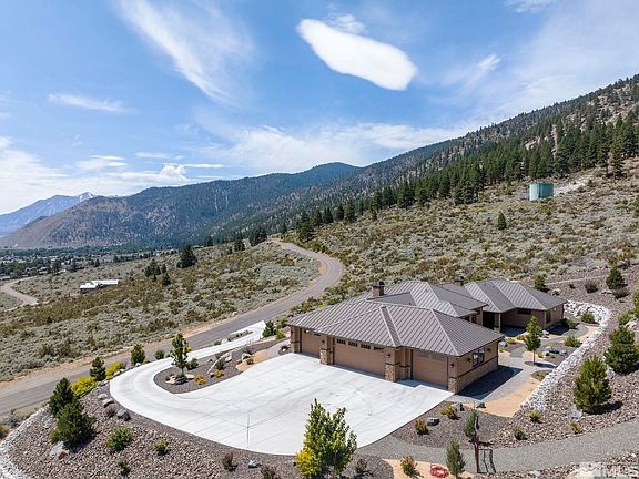 Step inside this well appointed custom home nestled on 11.49 acres with breathtaking views. Boasting 3,872 sf, this residence features 3bdrms, 3bth including a master bath with luxurious heated floors, top-of-the-line Kitchen Aide appliances in the kitchen and dual zoned heating and a/c. This Property is equipped with a state of the art indoor swim spa, providing year-round relaxation and fitness. A spacious oversized 4 car garage with an impressive 1,458 sf to store all you vehicles and toys, 24.5' depth., Swim spa room has separately contained HVAC and dehumidifier system with 1/2 bath and stone floors with drains. Off of the kitchen is wet bar fully equipped with sink, refrigerator and freezer w/ice maker. Great room and kitchen area have 12 ft. ceilings with exposed beams throughout. House has dual zoned heating and air conditioning with two water heaters, 75 gallon and 50 gallon. Garage has 50 amp plug for any electric car needs. Each guest room is ensuite and not included in bedroom count is a large office overlooking the entire Carson Valley and Sierra Mountain range.