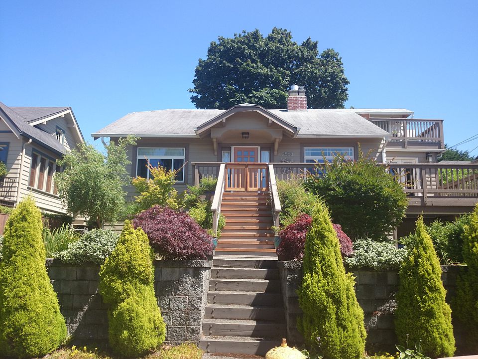 Classic 1920's Magnolia home emphasizing functional living and enlivened by period detailing. Updated kit, Fml dining boasts two sets of French doors to lg. decks, one facing East, one West, both sunny. Two bdrms and full bath on main. New Master Suite up with luxury bath, den and private view deck. New lower media rm and guest bdrm with full bath. Att garage and carport. 1920's features, modern amenities, thoughtful spaces and sited on an oversized lot, walking distance to shops and EB park.