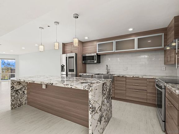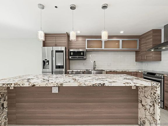 Experience elevated urban living in this beautifully reimagined 2BR/2BA Condo offering sweeping 180° Bay views from the glittering Downtown skyline to Point Loma. The spacious open layout showcases a chef’s kitchen anchored by a dramatic 10-foot granite cascading island, custom cabinetry, and premium SS appliances. The living and dining areas open to a large west-facing balcony where sunset bay views and airplane landings steal the show. The serene primary suite features peaceful bay views, a spa-inspired bathroom with a soaking tub, walk-in shower, marble & mosaic tile accents, plus a custom-designed walk-in closet. The generously sized second bedroom offers comfort and privacy for guests or office use with an adjacent stylish guest bath, finished with marble and designer tile. Throughout the home, enjoy luxury vinyl flooring, custom lighting, abundant in-unit storage, and the convenience of a full laundry room. All this in a perfectly positioned, well-maintained building, features solar panels for an almost zeroed out SDGE bill, steps from top restaurants, boutiques, cafés, and more.