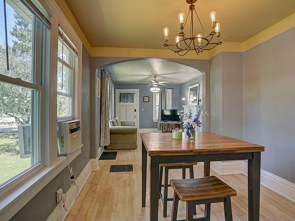Inside you’ll find fresh paint, a remodeled kitchen with stainless appliances and new flooring, plus a charming 3-season front porch and a handy back porch entry as well. The main floor highlights original hardwood floors in the living room, dining room, and bedrooms, along with a dining nook/bar and a decorative fireplace both accented by vintage sconces. Upstairs, a spacious third bedroom with new carpet and paint connects tandem-style to the second bedroom below—perfect for a guest suite, office, or playroom.