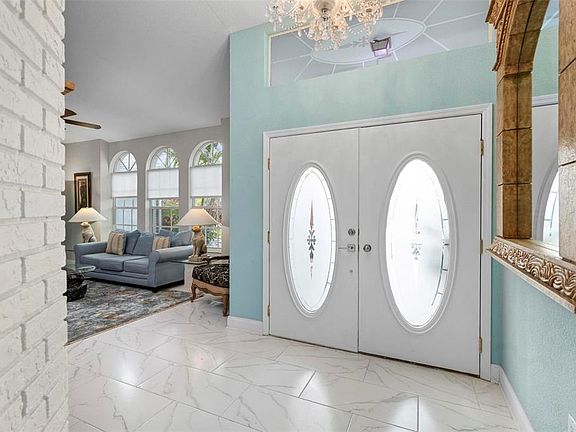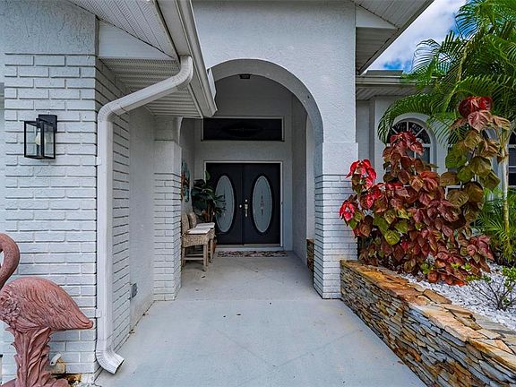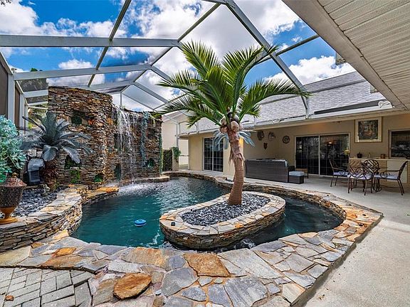 This turnkey 3-bedroom, 2-bath home in Deep Creek, Punta Gorda, offers a combination of elegant craftsmanship, modern updates, and an extraordinary outdoor living experience. Professionally landscaped with lush palms, natural stone retaining walls, and pavers wrapping around the home, the property creates a polished, resort-like ambiance from the moment you arrive. Step through the double front doors into soaring ceilings and an open, bright floor plan. The large great room features a stunning wood-burning fireplace as its centerpiece and flows seamlessly into the family room, providing plenty of space for relaxation, entertainment, and family gatherings. All new marble-like ceramic tile extends throughout the main living areas, enhancing the home’s clean and contemporary feel. The spacious walkthrough kitchen is a chef’s delight, with Corian countertops, stainless steel appliances, ample cabinet space, and a convenient window to the outdoor kitchen. The kitchen opens to the family room, making it perfect for entertaining or everyday living. Each bedroom is generously sized with large closets providing abundant storage. The primary suite is a private retreat, boasting porcelain floors, a Jacuzzi tub, a luxurious walk-in shower with multiple shower heads, and direct views of the breathtaking 12-foot waterfall cascading into the custom heated pool. Outdoor living is where this home truly shines. The custom pool features dramatic stonework, a tropical landscaped island with rebar-reinforced palm trees, and a 12-foot waterfall that provides both beauty and privacy. Surrounding the pool, pavers and patios gives multiple seating areas for entertaining or relaxing, and an outdoor shower adds convenience for post-swim clean-ups. The full outdoor kitchen includes ample counter space and seating, making it an entertainer’s dream. Recent updates provide peace of mind, including a complete HVAC system installed in May 2025, a roof replaced in 2022, and numerous interior and exterior improvements completed between 2024–2025. With its spacious interior, luxurious primary suite, breathtaking outdoor oasis, and meticulous attention to detail, this home is move-in ready and perfect for embracing the Florida lifestyle in comfort, style, and privacy.