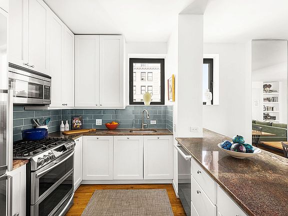 The spacious living area offers vistas of Central Park through every window and is spacious enough for a generous living area as well as a large dining table. Ideal for entertaining! The large, open, updated chef's kitchen has granite countertops, a glass-tile backsplash, and top-of-the-line stainless steel appliances, including a Bosch refrigerator, a Samsung Duo Door range (two ovens), and a whisper-quiet Miele dishwasher.