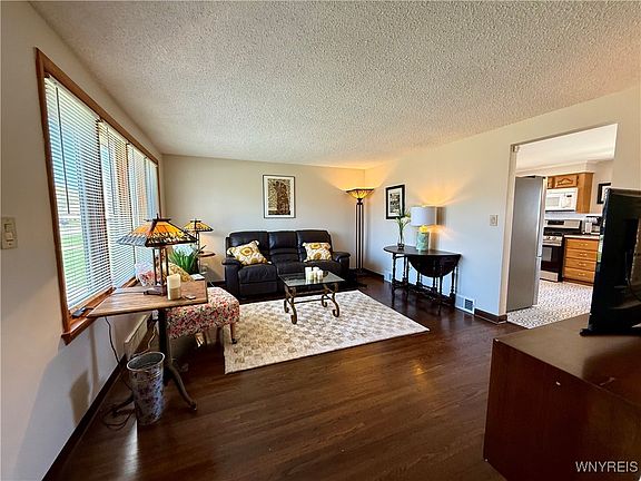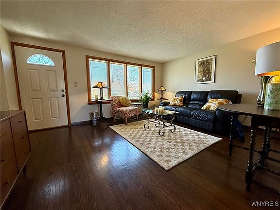 West Seneca brick Cape Cod home is move in ready and lives like a ranch. It features 4 bedrooms,2 bedrooms on the first floor with hardwood floors and new trim throughout. Central air and whole-house generator. Concrete front porch with yellow brick knee wall. Backyard 6 foot privacy fence. 1.5 car detached garage. Modernized bathroom with tub, lighted mirror, subway tile and decorative ceramic floor tile (2024). Updated kitchen with maple cabinets and Corian counters, dining area, flooring (2022), Samsung gas range (2021), and a high-end LG refrigerator (2025). The living room features a wall of windows, walnut-stained hardwood floors (2022), and beige walls and new trim (2024). Walnut treads with white risers highlight the staircase (2024). Seven white two-panel interior doors (2025) modernize the hallways. The two first-floor bedrooms have hardwood floors, fresh paint, and new flush light fixtures. The two upstairs bedrooms feature hardwood floors, and new drywall, insulation, trim, and recessed lighting (2024). Large attic storage in both bedrooms. The basement features gray floors and white walls, new trim, glass block windows, recessed lighting (2024), Samsung washer and dryer (2021), new hot water tank and new sump pump (2024), and forced-air furnace (2016). New landscaping and backyard birch and willow trees (2024). New asphalt architectural shingled roof installed in 2019, full tear-off. Quiet neighborhood. Well cared for residence in prime location! Includes: snow-blower, weber grill, and furniture in the basement.