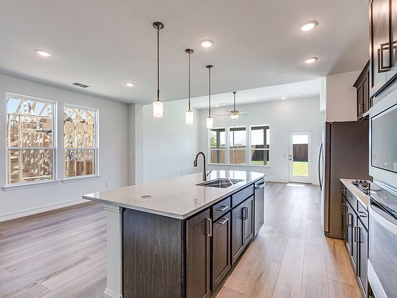 Barely lived in and Ready to move in!! This charming haven of comfort is perfect for a young, growing family and perfectly balances style, comfort, and convenience in the Spiritas Ranch Community! This exquisite home greets you with phenomenal warm natural light & high vaulted ceilings.This home features a crisp, modern, open design and includes upgraded Luxury Vinyl Planks on the first level, Quartz Countertops, Energy Star SS appliances, Gas Cooktop, and plenty of storage room. The open-concept layout creates a welcoming atmosphere, ideal for hosting gatherings or simply enjoying time with loved ones. Chefs kitchen boasts of high end Designer Tile Backsplash, 42-inch Kitchen Cabinetry, Designer LED and Pendent lighting and overlooks the open and bright living and dining room! Whether you're preparing a casual breakfast or a holiday feast, this kitchen offers the perfect setting to create lasting memories. Guest suite downstairs with full bath ideal for visiting guests or in-law suite. Upstairs is the spacious master bedroom with a huge walk in closet along 2 additional bedrooms and a loft. REFRIGERATOR & WASHER DRYER included!BLINDS throughout. Experience the joys of outdoor living in the covered patio backyard backing to the greenbelt. Energy efficient with low utility bills .Enjoy Tenants enjoy all amenities! Easy access to Freeways , PGA , Costco and Lake Lewisville!!
