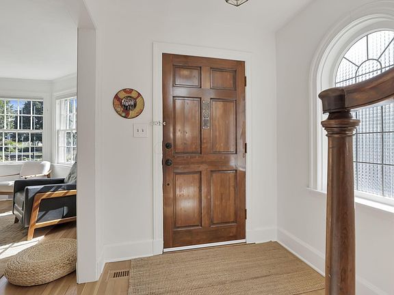 Step inside to a layout that flows like a dream, where natural light pours into the newly updated kitchen, with a refinished original metal oven hood, butcher block countertops and appliance upgrades. A new built-in pantry is not only incredibly functional but looks great with the doors open. Enjoy charming additions like the stained glass feature leading into the mudroom and a convenient half bath. The expansive countertop with tuck-under seating connects perfectly to a spacious dining room, ideal for family dinners or entertaining. The light filled living room has an updated gas log fireplace. Right off the living room find a three season room that would be a perfect office or hobby room. Enjoy the beautifully refinished hardwood floors throughout. The hard to find, first floor primary suite includes a private bath, built-in closet, and an adjacent sitting space, a perfect escape. All three second floor bedrooms offer charm, space, and ample light, with custom built-ins and thoughtful storage throughout.