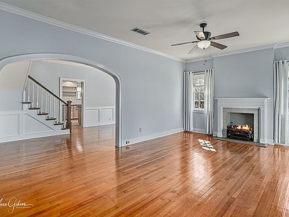 The cozy yet large den is grounded by rich hardwood flooring and features a wood-burning fireplace, flanked by cabinetry and shelving, with plenty of space for dining and gatherings. The hardworking kitchen has a dual fuel 36in range oven with griddle and custom Welbourne cabinetry, a creamy tile backsplash, brick paver looking, open shelves, & accent lighting. All of the appliances remain and a seller provided AHS warranty complete for the first 2 years. The formal dining area contains an original bay window and custom wainscoting characteristic of the home. A staircase leads to the bedrooms above, and both contain mini split HVAC units for perfect temperature control. Don’t miss the best of Broadmoor. You’ll be amazed at what this historic one-of-a-kind home has to offer! Wait, there's more, a whole home generator , brick paved patio with fountain and a floored attic in the garage and ring camera stays.