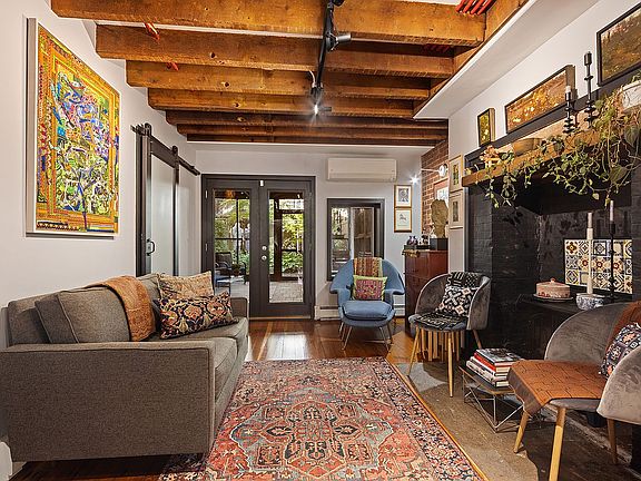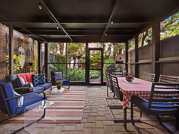 The garden level apartment, occupying the first two stories, offers an open Kitchen and Living/Dining space on the ground floor, as well as a small guest bedroom or home office, a full bathroom, and a large, peacefully quiet screened-in porch, overlooking a lush garden. On the Parlor floor, there are two sizable bedrooms and a second full bathroom. Currently being used as an artist’s studio, the rear Parlor could also serve as a large bedroom, that opens onto a spacious terrace. The parlor floor has 10'-10" ft ceiling heights accentuated by exceptionally large windows.