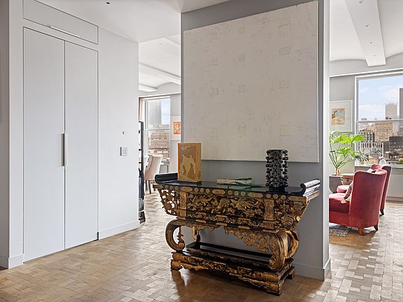 The spacious living/dining room is adorned with intricately laid wood floors, barrel-rolled ceilings, African wood built-ins, and panoramic views of the skyline including the Empire State Building and Hudson Yards. Control 4 smart home technology enables you to manage most systems in the home including temperature, lighting (including color LEDs), window shades, and the audio/video system, allowing you to create a comfortable ambiance for any occasion.