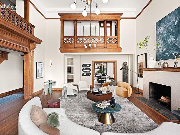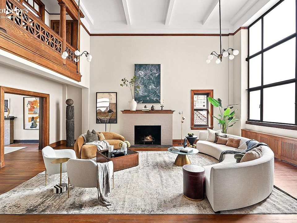 The centerpiece is a double-height living room crowned by a 20-foot ceiling and anchored by a 14-foot window that bathes the interior in even north light. The window’s nine etched-glass panes are currently being replaced with new ultra-clear low-lead glass. Overlooking the living room are a pair of original galleries with wood balustrades, carved in the cross-braced lattice motif that recurs throughout the building.
