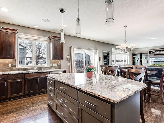 BEAUTIFUL, custom built home in high demand Woodland Estates! Feel the joy living in one of Andover's most desirable neighborhoods…location, location, location! Open floor plan w/south facing windows flood this home w/natural light. GORGEOUS gourmet kitchen w/HUGE (7x4) granite island, TONS of extra tall custom cabinetry w/roll out shelving, walk-in pantry & solid wood floors. SPACIOUS main floor great room, dining, bedroom/flex room, mudroom & bath. Four bedrooms, loft & laundry on upper level plus upper bath w/dual sinks. Primary bedroom w/ensuite bath featuring raised dual sinks & walk-in tiled shower. Prof finished walkout lower level w/additional kitchen/dining, rec/family room, bedroom, bath & storage. Perfect for multi-generaltional living or daycare! Heated, oversized & fin garage. Prof landscaped & fully fenced backyard w/mature trees, shrubs & perennials. New roof 2022. Close to Andover schools, YMCA & biking/walking paths. (No association too.) Come fall in love!