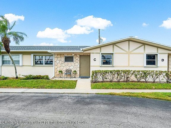Located in a 55+ community, Unit C has a New Roof 2024. New Gutters installed 2024. New Air Conditioner 2018. Sliding window units added to enclosed patio in 2019. Patio sliding doors additionally protected with hurricane accordion shutters. All appliances have been maintained through CAC appliance contract, which was renewed in October 2024. New owner able to utilize CAC contract through October 2025 if needed. No Assessments expected. Rental allowed after two (2) years of ownership of the unit. Carpets professionally cleaned and walls freshly painted. Close to pool, clubhouse and all activities!