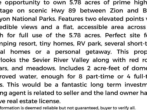 Rare opportunity to own 5.78 acres of prime highway frontage on scenic Hwy 89 between Zion and Bryce Canyon National Parks. Features two elevated points with incredible views and a flat, accessible area across the wash for full use of the 5.78 acres. Perfect site for a glamping resort, tiny homes, RV park, several short-term rental homes or a personal getaway. This property overlooks the Sevier River Valley along with red rocks, cedars, and meadows. Includes 2 acre-feet of domestic approved water, enough for 8 part-time or 4 full-time units. This would be a fantastic long term investment. Listing agent is related to seller and the land owner has an active real estate license. All information is deemed reliable but not guaranteed, buyer to verify all.