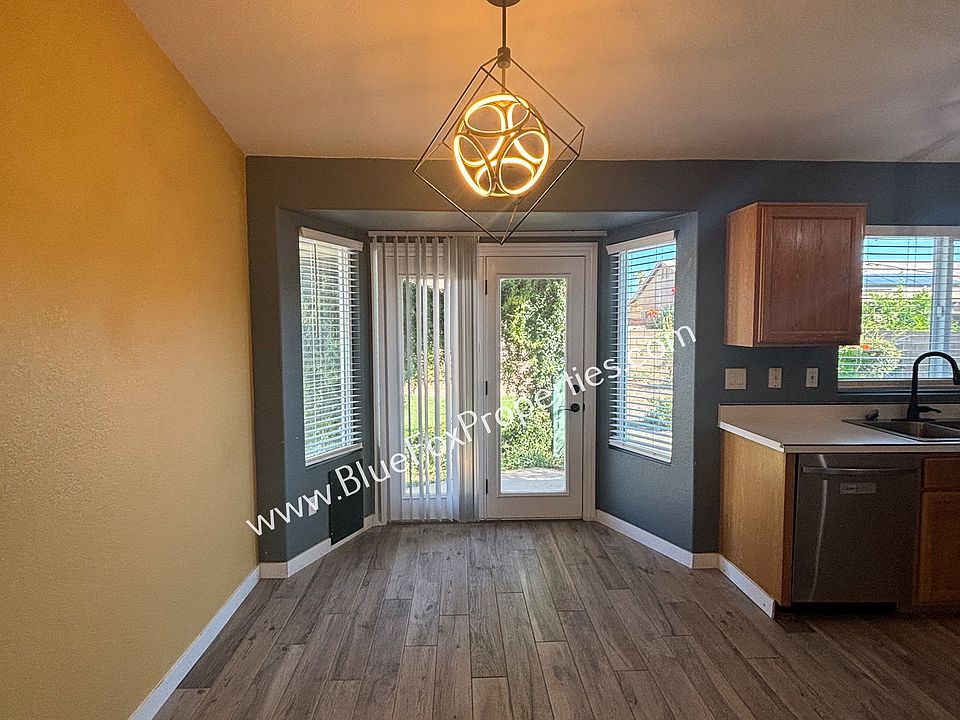 Welcome to this charming 3-bedroom, 2-bathroom home nestled in a quiet cul-de-sac! This move-in ready property features a brand new roof (2024), and wood-look tile flooring throughout. Step into a spacious living room that flows into a well-appointed kitchen, complete with a stove, built-in microwave, dishwasher, refrigerator, pantry closet, and ample cabinet space. The adjacent dining area includes a convenient doggy door. Laundry room with washer/dryer hookups. The primary suite offers a private retreat with a modern barn door, double sink vanity, glass-enclosed standing shower, and a walk-in closet. Enjoy the large, landscaped, and fenced backyard with a small lawn and covered patio, ideal for relaxing or entertaining. A 2-car garage for convenience. Located just one house away from a park and playground, with an open athletic field directly across the street. Do not miss out on this lovely home!