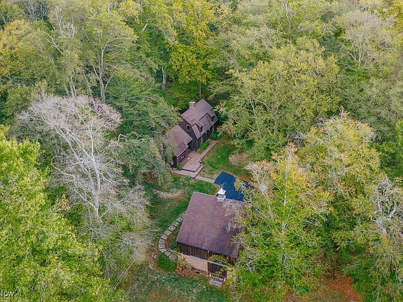 concrete floors and drive-in access from the lower yard. Through the trees towards the back of the property is a fully