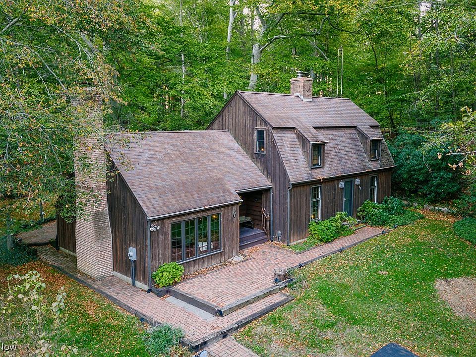 pond! The home features a cozy den with hardwood floors, wood ceilings, and a brick fireplace with a wood-burning stove.