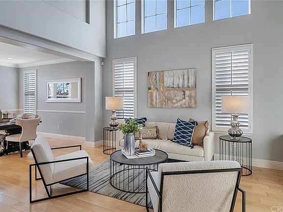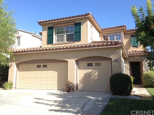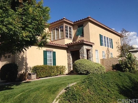 Beautiful Stevenson Ranch VIEW home located on a private corner lot with beautiful mountain views. With nearly 3000 sqft, this home features 5 spacious bedrooms, and PAID SOLAR! One bedroom and bath is conveniently downstairs and is currently a beautiful office with custom built-in desk, bookcases, and custom shuttered window open to family room. Interior features include a light and bright open floorplan with separate formal dining room and living room with vaulted ceilings. The newly renovated gourmet kitchen is complete with quartz counter tops, herringbone subway tile, new stainless steel appliances, double ovens, breakfast eating area, island with breakfast bar, floating shelves with custom wine rack and ample cabinet space. The kitchen has a slider for direct access to the serene backyard and opens to the family room with a fireplace and lots of natural light. Upper level features a built-in desk/work area, 4 large bedrooms, 2 baths, and laundry room. The large master bedroom suite features gorgeous mountain views! The master bath features his and hers vanities, separate shower/tub and dual walk-in closets. The large 3-car garage features a NEMA 15-40 240V / 40A outlet suitable for high speed charging of Tesla and other electric vehicles. Other highlights include fresh neutral designer paint throughout, crown moulding, updated flooring, recessed lighting. Walking distance to Richard Rioux Park and award winning Stevenson Ranch Elementary!