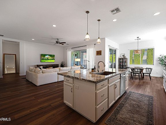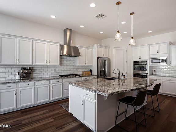 Welcome home to this stunning Verrado beauty with all the amenities! At 3000 sq ft there is room for all your hobbies, family & guests. Gorgeous courtyard w/ gated entry, durable wood laminate flooring throughout. 4 bedrooms, 2.5 bath, 3 car garage & fenced play pool w/spa! Abundant light throughout. As you enter take note of the pocket sliding doors to either your office or exercise room, the gorgeous dining room & two bedrooms at the front of the home. Take in the spacious living room, open kitchen & dining area. Sliding glass doors to your dream backyard. Owners suite, additional bedroom, laundry & garage access on the north end. Owners suite complete with private backyard access, gorgeous ensuite & large walk in closet. Welcome Home!