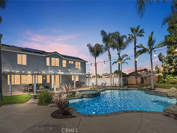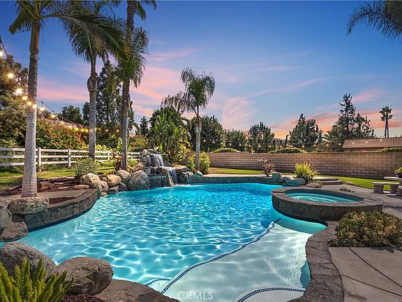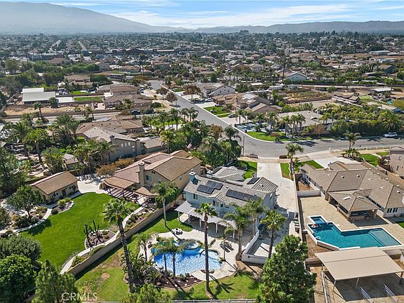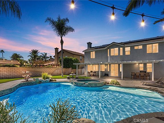Welcome to this stunning pool home located in the highly desirable neighborhood of Remington Estates. Designed for entertaining and comfortable living, this home has a terrific open floor-plan featuring 5 bedrooms, 3 baths, and 3,175 sq ft of living space. The formal entry greets you with high ceilings, a living room with fireplace, and a large dining room. The butler’s pantry connects you to the beautiful kitchen with wood cabinetry, upgraded tile counters, backsplash, an island with counter seating, and a breakfast nook opening to the spacious family room with fireplace and built-in media center. A wall of windows and sliding door allows views of the gorgeous backyard opening to the large, covered patio to enjoy indoor and outdoor living. Features include a downstairs bedroom and full bath, laundry room, porcelain tile floors, recessed lighting, window shutters and blinds, crown molding, 6” baseboards, fire control system, solar panels, and dual climate zoned A/C. Upstairs is a loft area with seating and desk area, leading to the beautiful and spacious primary suite with walk in closet, dual vanities, privacy door, soaking tub, and shower. Down the hall are 3 spacious secondary bedrooms with walk-in closets and a hall bath with two sinks. This home includes a 4-car garage with 2 of the spaces converted into a fantastic game room with wood-stained floors, bar seating, lighting and barn painted doors. Enjoy your own backyard paradise featuring a gorgeous natural rock saltwater pool and spa with waterfall and grotto, diving rock, lush landscaping, numerous palm trees, privacy, multiple seating areas, lighting, and an expansive lawn with white vinyl 3-rail fencing. The large covered patio includes ceiling fans, entertaining space and BBQ center. Located on a premier corner flag lot, this home offers an oversized driveway, beautiful curb appeal with manicured lawn and landscaping, gated RV parking with hook-ups, and room for all your toys. A terrific equestrian neighborhood with horse trails, a park down the street, nearby shopping, restaurants, schools and freeways. No HOA and no mello roos. An absolute must see home, Don’t miss out on this incredible opportunity!
