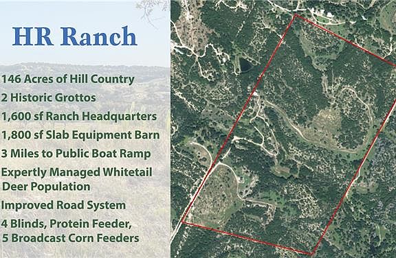 Hunter, Equestrian, or Investors dream. 3mi to Gloster Bend public boat ramp on Lake Travis. The road system connects potential home sites & panoramic views. Follow Flat Creek through the ranch and experience the beauty and history of the natural grottos carved by centuries of running water. Managed for whitetail deer, free-range trophy bucks have been harvested each year. An 1800 sf slab equipment barn is full of equipment that will convey, including a nearly- new John Deere tractor and implements