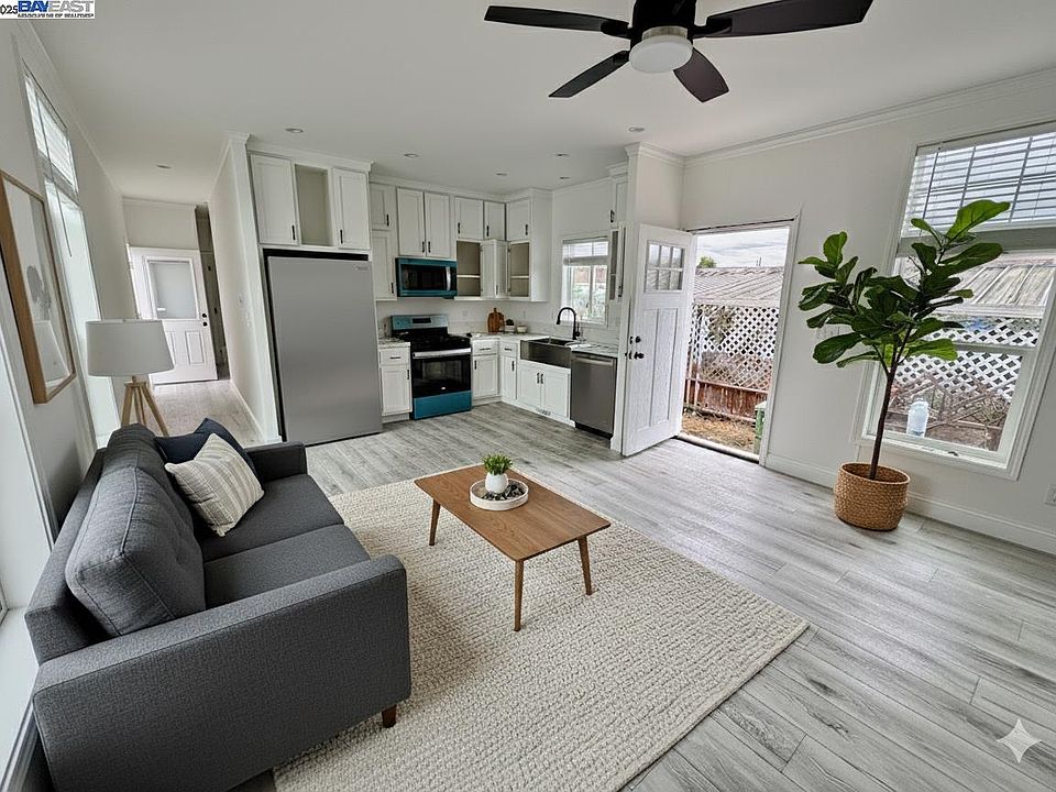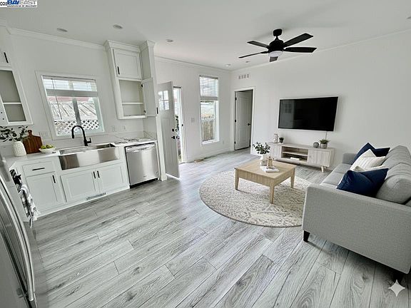 2025 single-wide manufactured home with 1002 sq ft of living space. This layout features 3 bedrooms and 2 full bathrooms. The home offers a modern, open-concept kitchen/living area with light gray plank flooring throughout. The kitchen includes white cabinets, a farmhouse-style sink, and stainless steel appliances (dishwasher, range/oven, and refrigerator).